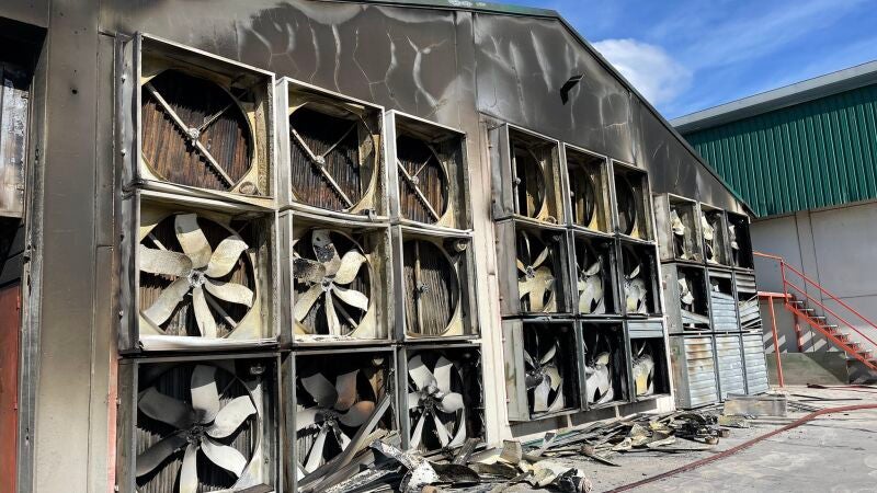 Los bomberos han evitado que el fuego se extendiera a otras naves que sí contenían animales. Dos trabajadoras de la empresa de empaquetamiento de huevos en la que se ha producido el incendio han sido atendidas por los servicios de Protección Civil por inhalación de humo.