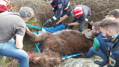 Bomberos de Madrid rescatan en helicóptero a una burra atrapada entre zarzas y alambres