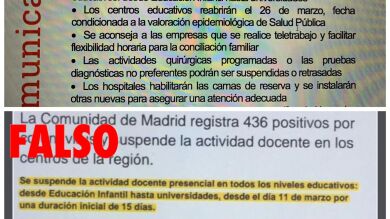 Hay quien se dedica a sembrar la confusión en lugar de a ejercer la responsabilidad y ya hay circulando bulos que incrementan la incertidumbre después de las nuevas medidas de contención del coronavirus . El último es una falsa nota con apariencia de oficial atribuida a la Comunidad de Madrid en la que se puede leer que “la perdida para el alumnado será recuperada para todos los ciclos formativos desde el 1 al 20 de julio del presente año" se permite incluso añadir que "también se valora el hecho de que los alumnos acudan a las aulas los sábados desde el 1 de abril hasta completar los 15 días de la perdida de curso y así cumplir con el curso escolar completo, tanto para profesores como el alumnado” y aclara que “tan sólo el alumnado de educación infantil estará exento de esta recuperación de clases".