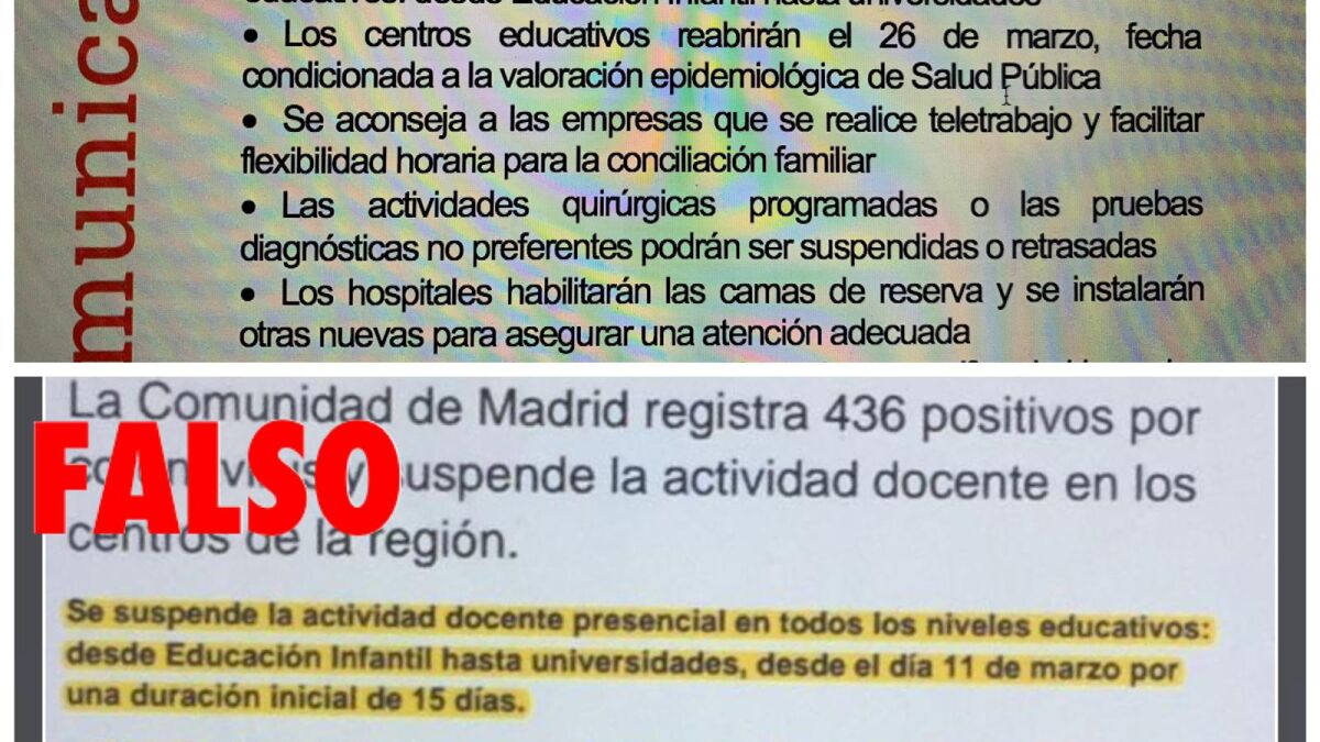Se trata de un bulo que no se corresponde con la auténtica comunicación de la Comunidad de Madrid con respecto al coronavirus que especifica que "se suspende la actividad docente presencial en todos los niveles educativos: desde Educación Infantil hasta Universidades".