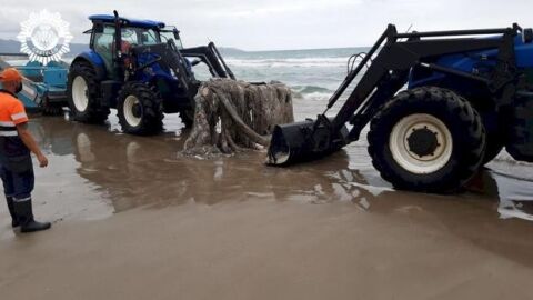 Un calamar gigante ha aparecido muerto este este domingo en la playa del Gurugú, en Castellón. El cadáver ha sido recuperado por agentes de la Policía Local y el servicio municipal de recogida de residuos,