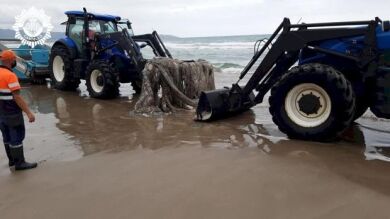 La policía local de Castellón ha localizado el cadáver de un calamar gigante en la playa del Gurugú, dos días después de hallar un delfín muerto en la misma zona.