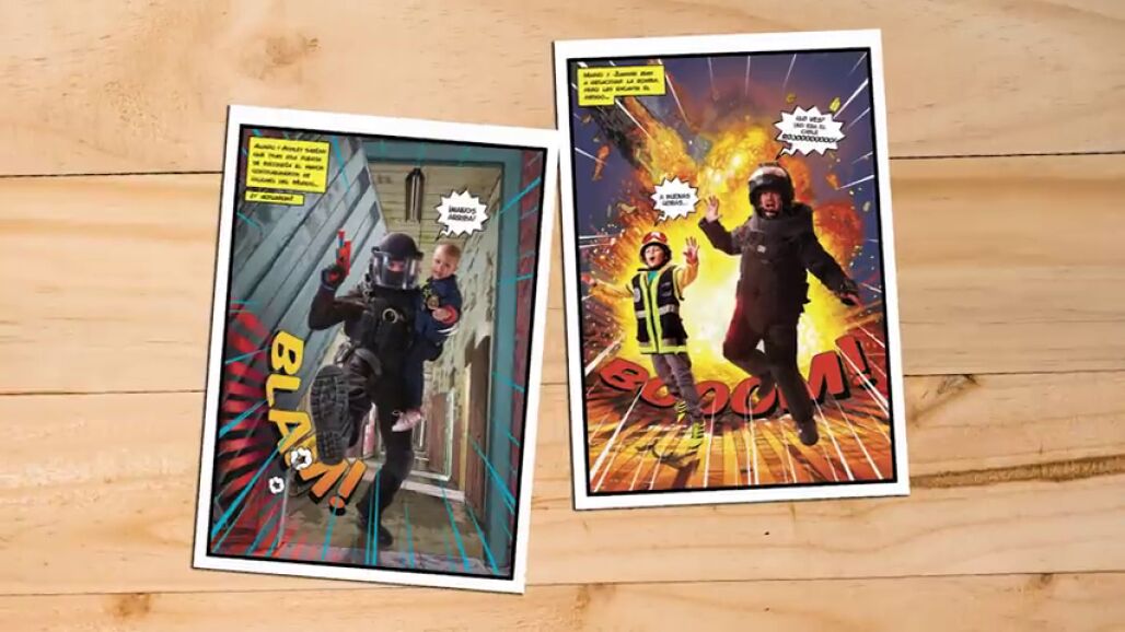 El almanaque recuerda las páginas de un cómic con aventuras como una operación para detener 'al mayor contrabandista de chuches', en la búsqueda de supervivientes de un terremoto o el procedimiento para desactivar una bomba. Todas las páginas del calendario tiene un mensaje común, según Leire, la protagonista de la portada: "Ante cualquier adversidad, adelante, siempre, adelante".