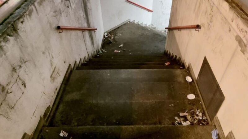 Sin embargo, es precisamente un acceso a uno de estos edificios comerciales del barrio lo que lo mantiene en el punto de mira. Se trata de un paso subterráneo en la calle Jenaro de la Fuente que lleva directamente al Centro Comercial Bodegas Bandeira. El fuerte olor ya avisa, antes de bajar las escaleras, de lo que se puede encontrar dentro. Heces, orina y montones de basura. Hay botellas de alcohol, ropa y hasta restos de papelinas de droga.