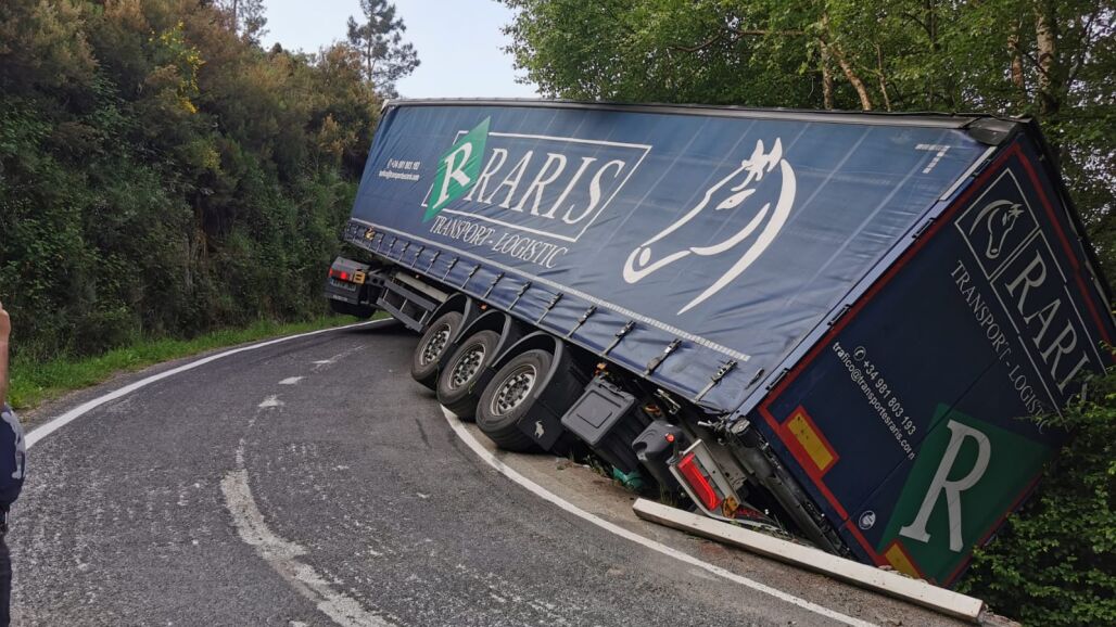 El siniestro se ha producido cuando el camión se salió de la vía y quedó totalmente encajado en una curva de la carretera que une la localidad de Maceda con el alto do Rodicio. La vía permanece cortada a la espera de que una grúa pueda rescatar el vehículo.