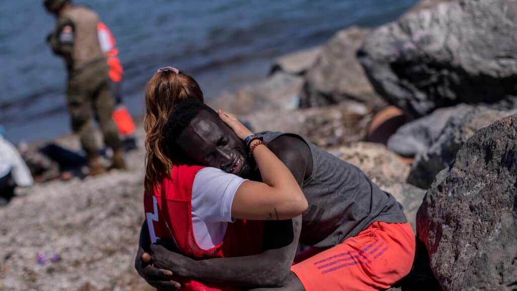 Es una de las imágenes de la crisis migratoria en Ceuta entre España y Marruecos, la joven de la Cruz Roja que abraza a uno de los migrantes que llegan a laplaya del Tarajal. La voluntaria, Luna, aparece en las imágenes consolando al migrante mientras al fondo de la imagen los sanitarios tratan a su compañero.