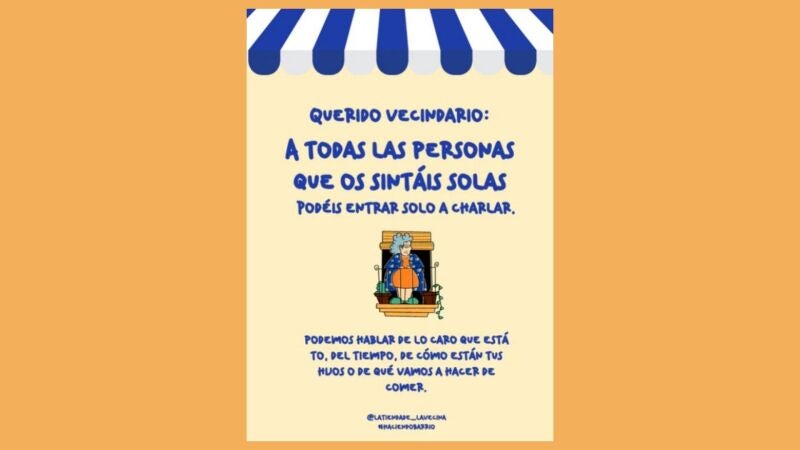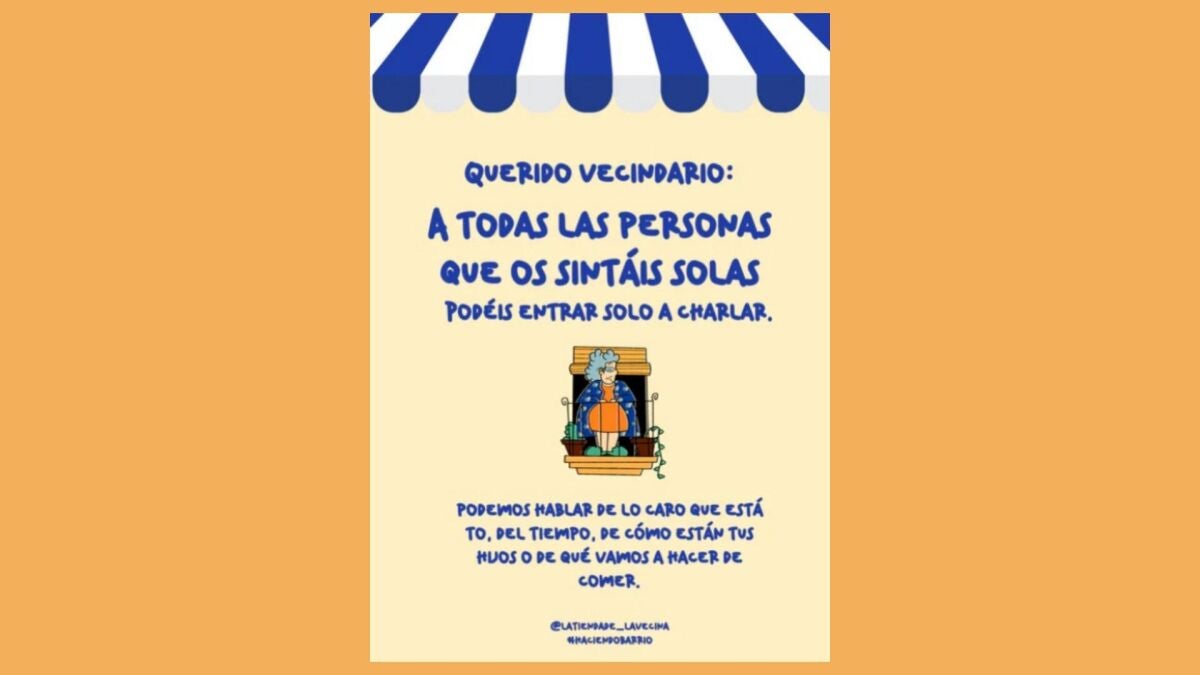 "Querido vecindario: a todas las personas que os sintáis solas podéis entrar solo a charlar. Podemos hablar de lo caro que está to, del tiempo, de cómo están tus hijos o de que vamos hacer de comer".