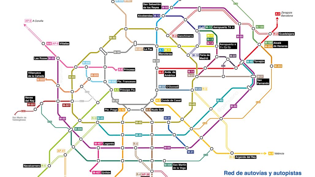 Por suerte o por desgracia, en estos casos el coche se convierte en nuestra única forma para movernos por la capital. Para aquellos acostumbrados a desplazarse en el transporte urbano madrileño, el salto del vagón de metro al vehículo de cuatro ruedas puede resultar cuanto menos una tarea algo ardua, sobre todo teniendo en cuenta la cantidad de autovías y autopistas que conforman la red en la Comunidad de Madrid. Decenas de carreteras interconectadas que hacen que a veces por un trayecto de escasos 10 minutos hayas tomado cuatro salidas diferentes y pasado por cuatro vías diferentes que ni si quiera conoces su nombre. Al final, los conductores acaban depositando toda su confianza en el GPS que los va guiando en todo este enmarañado de autopistas sin saber muchas veces ni en qué punto de Madrid están. Comparado con el esquemático plano de metro, el mapa de carreteras madrileñas se vuelve en un complejo rompecabezas difícil de resolver. Ahora, un usuario de Twitter ha desarrollado la solución definitiva para aquellos conductores más noveles y/o despistados que buscan una versión más ‘asequible’ de las carreteras de Madrid: el mapa de autovías de Madrid al estilo del metro.