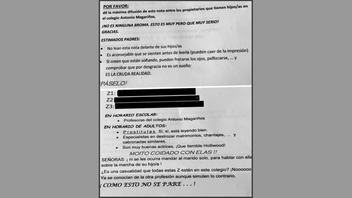 Las cartas han llegado también al resto de profesores y a las casas de los alumnos. En ellas se puede leer los nombres de las maestras y, tras advertir a los padres de que "no lean esta nota delante de sus hijos/as", continúan explicando que estas mujeres ejercen de "profesoras en el colegio Antonio Magariños" y, "en horario de adultos", son prostitutas, "especialistas en destrozar matrimonios, chantajes… y cabronadas similares".