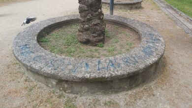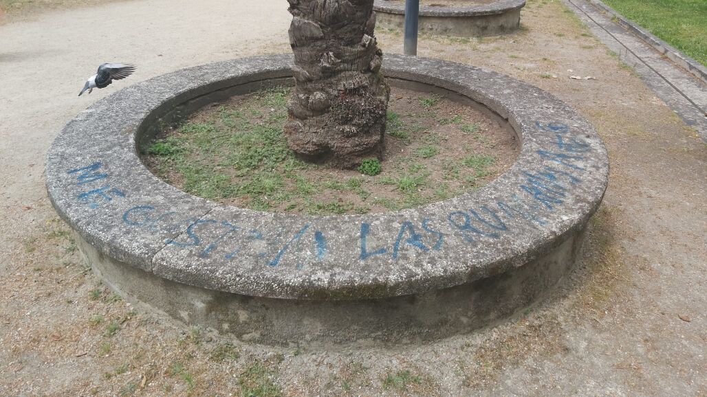 "Me gustan los negros" es una de las frases que se podía leer en una de las bases de piedra de las palmeras que hay en este espacio, pero no es la única. Distintos símbolos, letras o palabras también quedaron marcados en muros y árboles del recinto.
