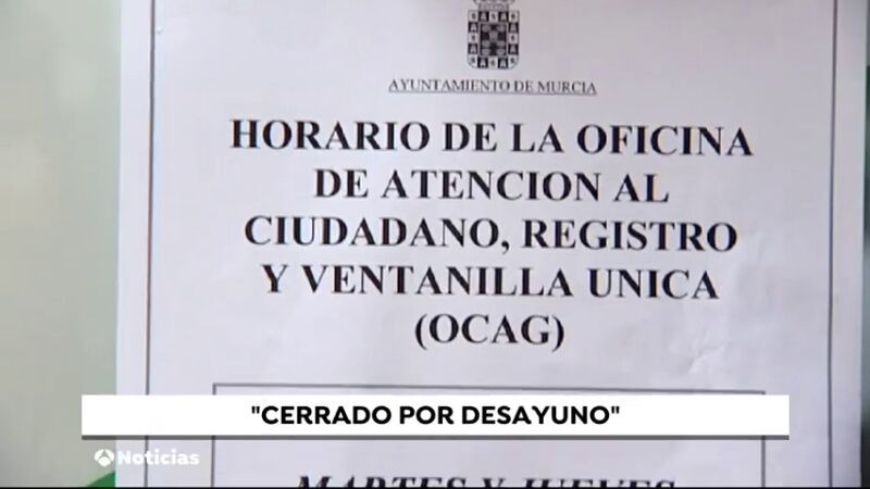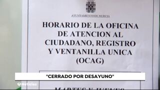 El horario de la oficina de atención al ciudadano en esta localidad murciana es de 9 de la mañana a 2 de la tarde. Por ello, los vecinos se quejan de que los funcionarios desayunen en pleno horario laboral.