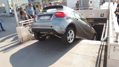Un coche queda atrapado por accidente en la boca del Metro de Plaza España de Barcelona