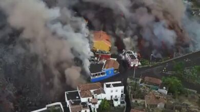 En este vídeo se ve a vista de pájaro como la enorme colada de lava va destruyendo o aislando todas las poblaciones que encuentra a su paso. Además se aprecia como los tejados de las viviendas que resisten en pie se cubren de cenizas.