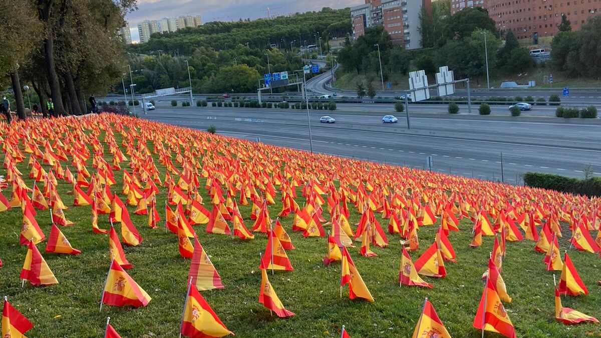 La Asociación Nacional de Víctimas y Afectados por Coronavirus ha colocado 53.000 banderas de España sobre el césped en recuerdo a las víctimas del coronavirus.