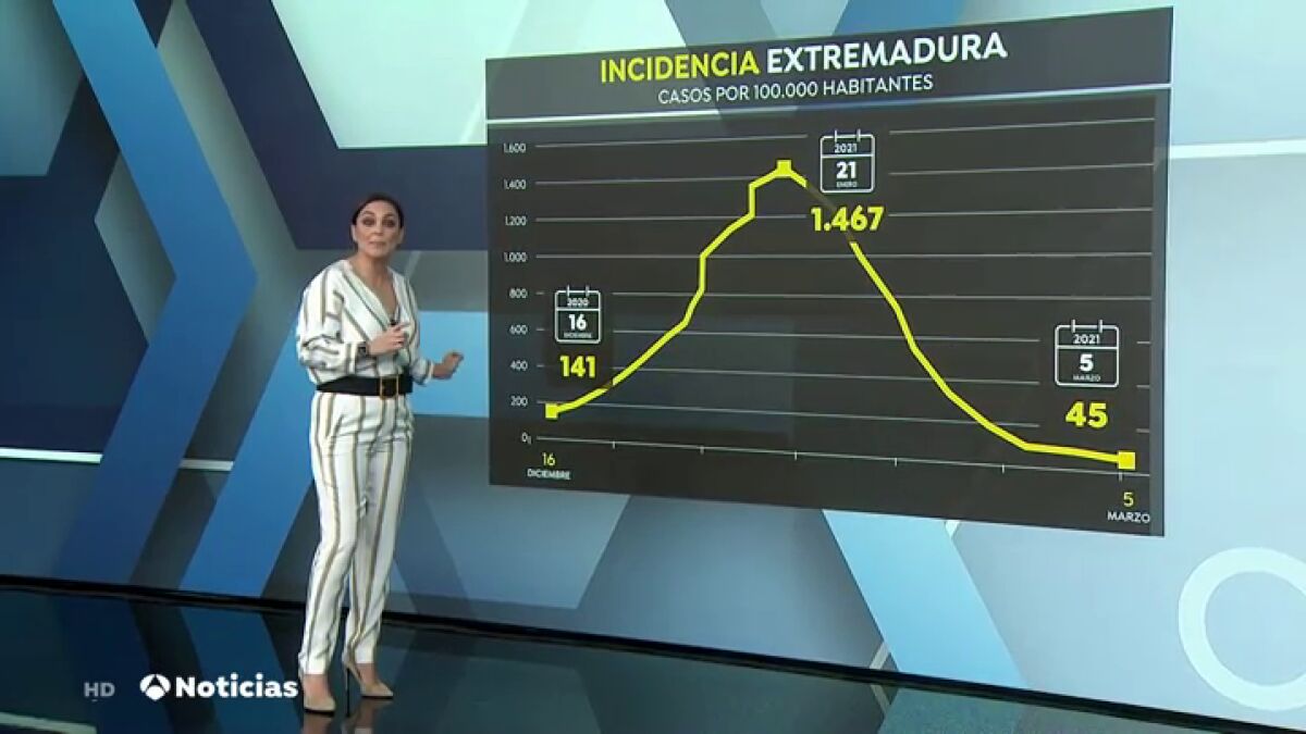 Extremadura ha dado la vuelta a la situación dramática por el coronavirus que se ha vivido después de las Navidades. La incidencia acumulada a día 21 de enero era de 1.467 casos por cada 100.000 habitantes, la más alta de toda España. Esos datos situaban a la comunidad en riesgo extremo de contagio. Sin embargo, las medidas adoptadas han provocado que en un mes y medio la incidencia caiga hasta los 45 casos por cada 100.000 habitantes, situándose en riesgo bajo de transmisión. Además, en la última semana no hay que lamentar fallecidos por coronavirus en las residencias de ancianos de la región.