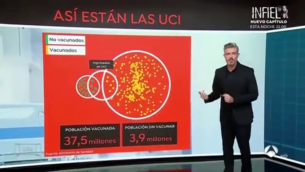 Ese dato se traduce en la ocupación de las UCI de coronavirus en España. Según los datos que ha dado esta semana la ministra de Sanidad, Carolina Darias, 6 de cada 10 de estos pacientes no están vacunados. Es decir, que el 40% sí lo está. Puede parecer un dato muy alto, pero hay que verlo en su contexto.