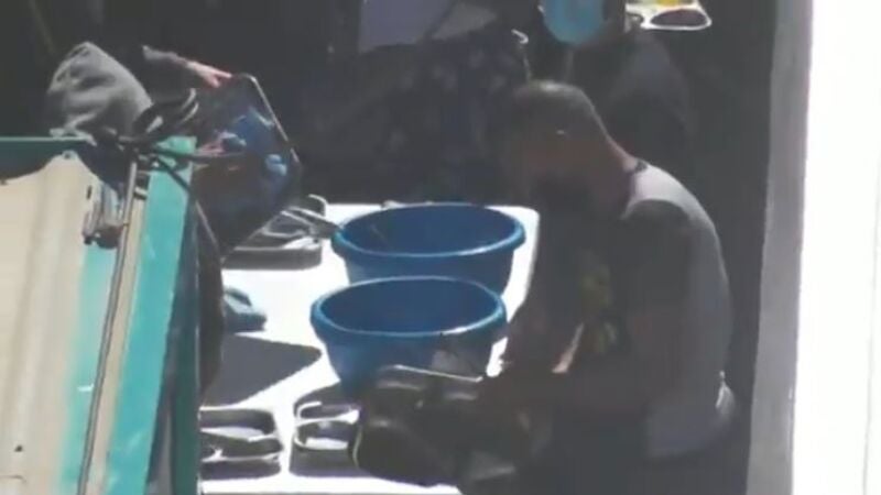 Las imágenes están grabadas desde el exterior del campamento, porque no se ha autorizado la entrada a los campamentos en Canarias ni a la prensa ni a los parlamentarios que lo han solicitado visitarlos. En las imágenes se puede ver cómo los inmigrantes tienen que hacer largas colas para comer, cómo lavan las bandejas en las que comen. En las imágenes también se ve la ropa extendida sobre arbustos para que se seque y también pancartas de protesta.