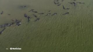 60 voluntarios llevan más de 24 horas tratando de rescatar a decenas de ballenas varadas en una playa remota de Australia. Han conseguido salvar a 25 pero calculan que han muerto cerca de 90. Se quedaron atrapadas en un banco de arena.