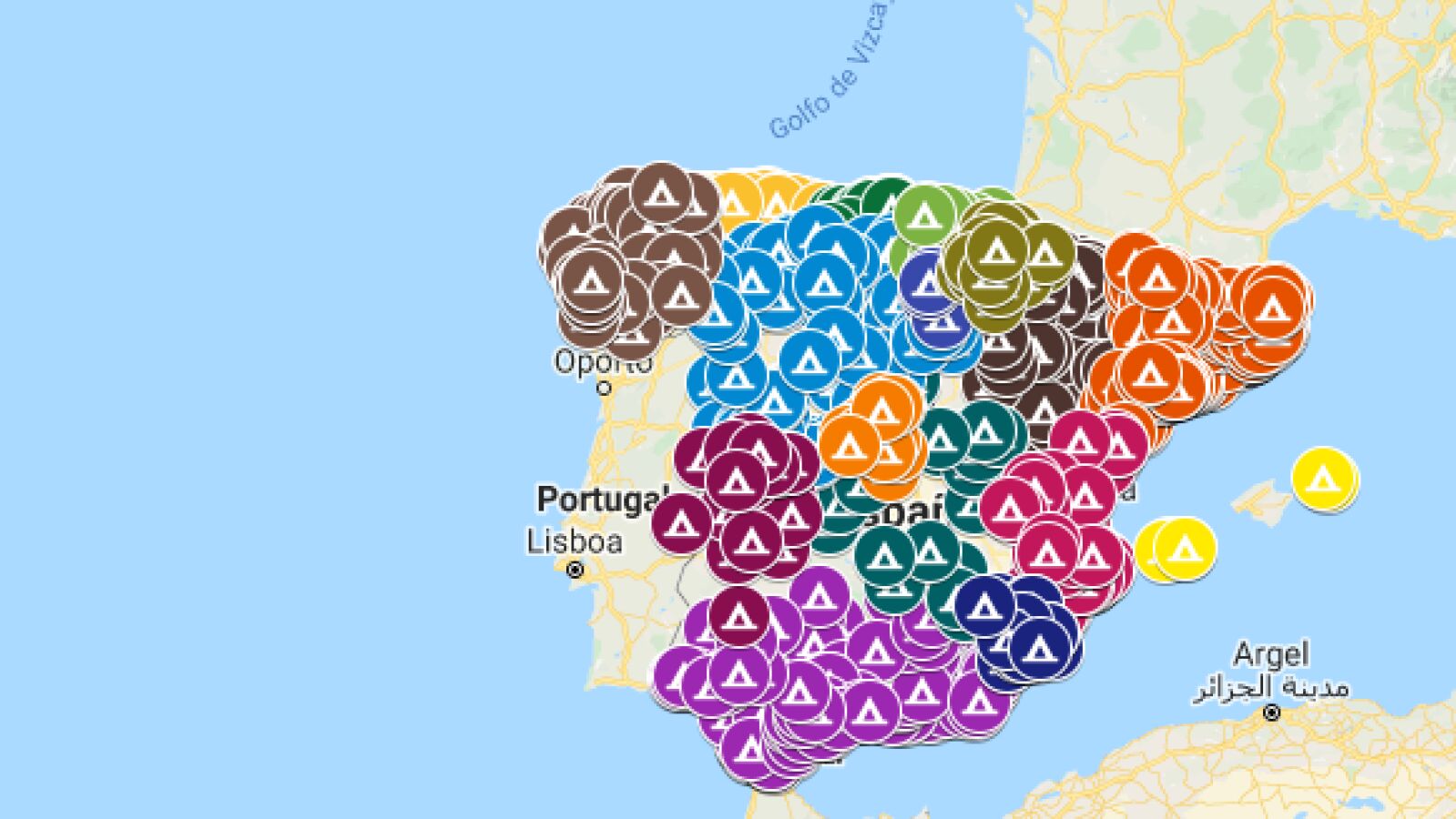 La oferta de campings es muy variada: los podemos encontrar a poco kilómetros del mar o en plena naturaleza. Cada camping está identificado con un color que depende de la comunidad autónoma en la que se encuentre. Cataluña es la comunidad autónoma con más campings con un total de 236, seguida de Andalucía con 147 y Aragón con 93.