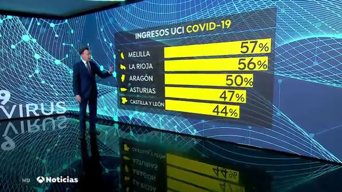 Ahora mismo hay cinco comunidades autónomas con mayor presión en las UCIs. Melilla con un 57% de pacientes de Covid-19 en sus unidades de cuidados intensivos, La Rioja con un 56%, Aragón con un 50% y Asturias con un 47. Castilla y León con un 44% empieza notar los efectos de la restricciones.