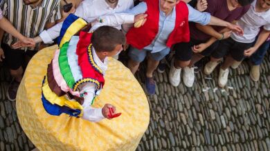 Los danzadores de Anguiano (La Rioja), han rendido su tradicional homenaje a la patrona del pueblo, Santa María Magdalena, con sus vueltas sobre sí mismos mientras descienden por una cuesta empinada y empedrada, subidos a unos zancos de madera de 45 centímetros, en una tradición documentada en el siglo XVII.