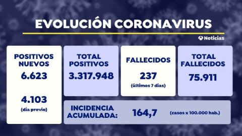 La cifra total de contagios por coronavirus en España asciende a 3.317.948 desde el inicio de la pandemia, mientras que la de fallecidos por covid-19 en todo el país se sitúa en 75.911.
