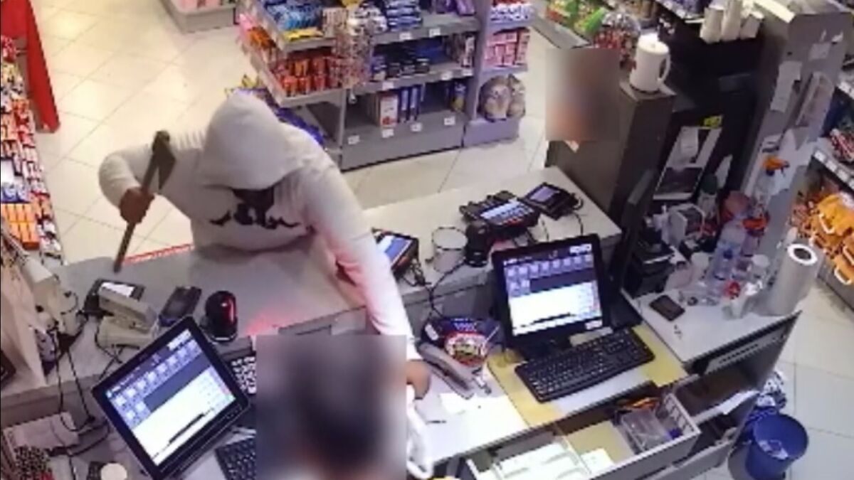 Entra a la gasolinera ocultando su rostro con un pasamontañas y con una capucha, levanta un hacha con violencia y le pide a la empleada de la gasolinera todo el dinero de la caja registradora. Amenazante, violento y bloqueando a la trabajadora, que no tiene capacidad de reacción. El atracador no baja el hacha en ningún momento mientras le da una bolsa de plástico para que la llene con todo lo recaudado en caja. La mujer deposita en esa bolsa todas las monedas y billetes y el asaltante huye a toda velocidad.