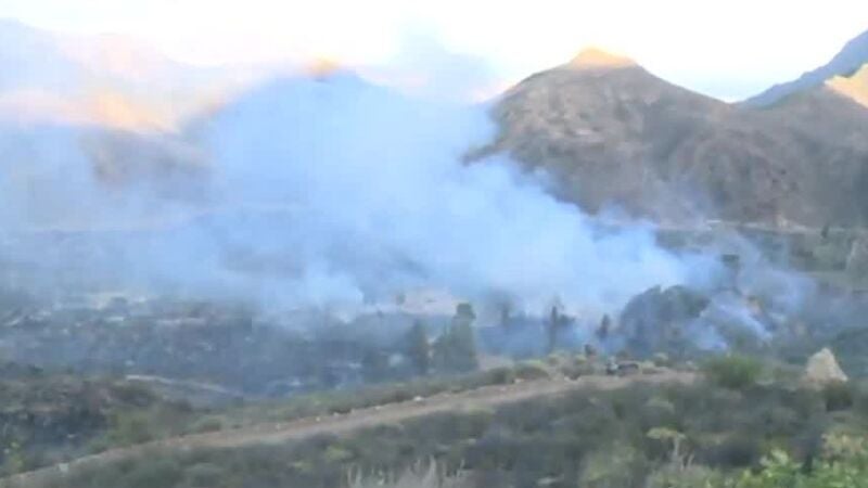 Los servicios de emergencia trabajan en la extinción de un incendio que se ha declarado durante las horas centrales de este sábado en el palmeral situado junto a la piscina del Hotel Molino del Agua, en la zona de Fataga (Gran Canaria). Las instalaciones han quedado bastante dañadas y los 16 ocupantes fueron desalojados,