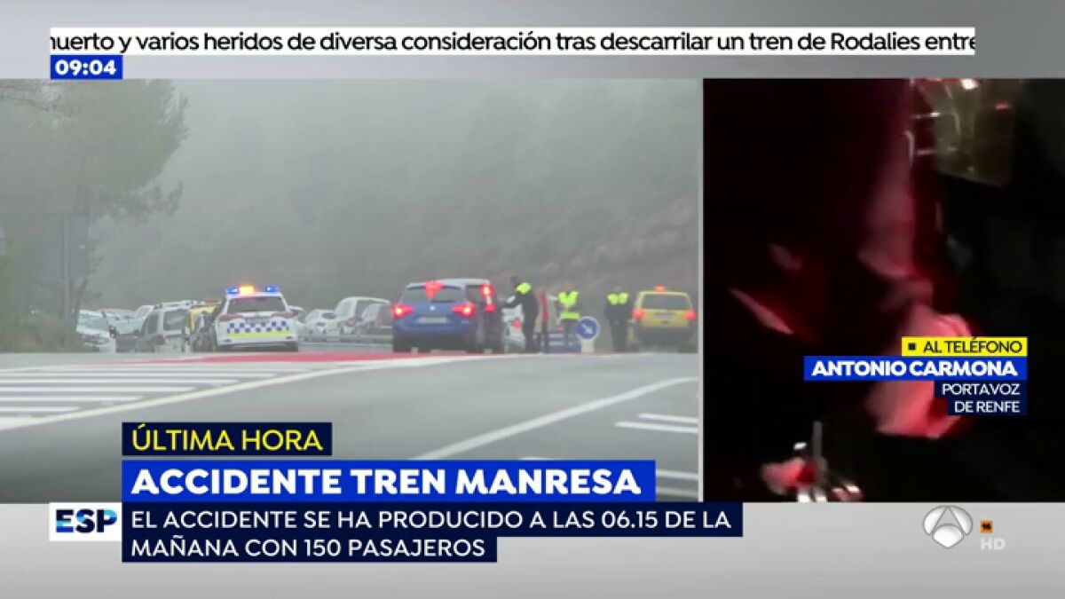 A las 06.15 horas de la mañana se ha producido el descarrilamiento, por un desprendimiento, de un tren de la línea R4 Manresa 05:52 - Sant Vicenç de Calders. Ha ocurrido entre Vacarisses y Vacarisses Torreblanca. En el tren había 131 viajeros. Según ha confirmado Protección Civil, una persona ha fallecido, hay tres personas menos graves y 41 leves.