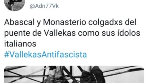 El mensaje fue publicado por una cuenta que acabó siendo suspendida el lunes 5 de abril. En el mensaje del tuit se podía leer: "Abascal y Monasterio colgados del puente de Vallecas como sus ídolos italianos. Vallecas Antifascista", han comunicado fuentes de la investigación.