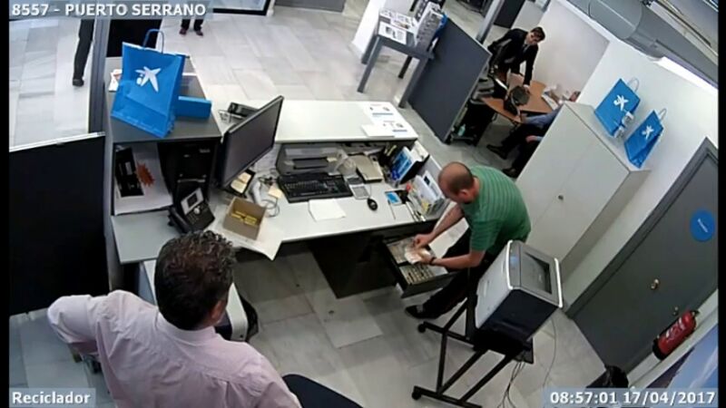 Sucedió el pasado martes en la localidad gaditana de Puerto Serrano. Una persona entró en la sucursal de La Caixa y amenazó con un cuchillo de cocina a un empleado. Aunque le advirtió de que las cámaras estaban grabando, el asaltante insistió. Le reclama el dinero, "por las buenas o por las malas". El empleado, que conoce al atracador porque es cliente, se aparta, para que pueda abrir el cajón y coger el dinero. Cuenta 500 euros y se los lleva.