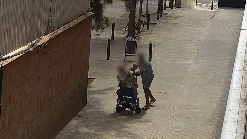 En el vídeo se puede ver perfectamente cómo el atacante, aprovechando que el hombre con movilidad reducida está de espaldas, lo persigue y da el primer tirón de la cadena. La víctima intenta evitarlo, protegiéndose el cuello, y el presunto agresor se aleja un poco y recoge las partes del collar que se han caído al suelo, pero acaba volviendo y consiguiendo su objetivo: arrancarle la joya del cuello con brutalidad. La víctima no puede defenderse y acaba sufrió lesiones en la zona del cuello como consecuencia del robo.