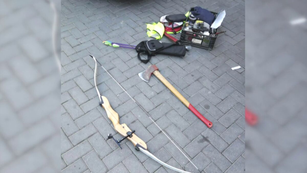 El hacha es de grandes dimensiones y el arco también, pero afortunadamente, la cosa no fue a más. La Guardia Civil y la Policía Local de Maracena, lo interceptaron cuando huía y le requisaron las armas antes de que hiciera ninguna locura. Finalmente, el hombre fue puesto a disposición judicial.