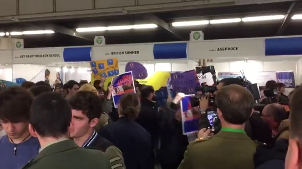Distintas plataformas contrarias al Ejército se manifiestan frente a su stand en el Salón de la Enseñanza de Cataluña