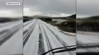 Hay doce provincias en alerta por tormentas y lluvias. En Mora de Rubielos, Teruel, incluso ha caído una fuerte granizada. En Durango, Vizcaya ha estado lloviendo con fuerza este lunes por la tarde. Lo mismo que en Villarroya de la Sierra, en Zaragoza. También llueve en el centro de la península.