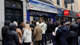 Doña Manolita ha reabierto sus puertas después de que esta mañana echara el cierre al establecimiento ante la amenaza de la caída de una cornisa por el fuerte viento que está dejando la borrasca 'Fabien', a un día de que se celebre la Lotería de Navidad 2019.