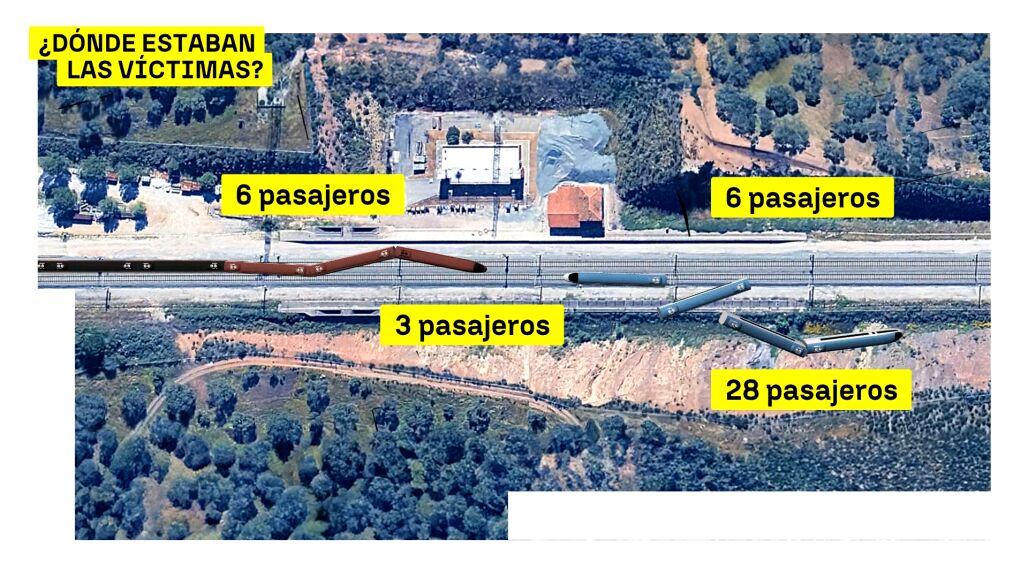 La mayoría de los fallecidos viajaban en el Alvia: en total, 28 personas han perdido la vida dentro de este tren, entre ellas el maquinista. Además, otras seis víctimas han sido halladas en las vías tras salir despedidas del convoy. En el tren Iryo se han recuperado seis cuerpos más, y otros tres han aparecido entre ambos trenes, lo que da cuenta de la violencia del impacto.
