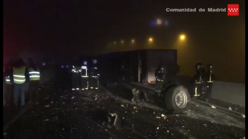 El camión quedó volcado bloqueando la vía de servicio y el camión que venía detrás no pudo esquivarle. El segundo camión hizo el efecto tijera quedando sobre su propio pie y su cabina destrozada. Los camioneros resultaron heridos con pronóstico leve.