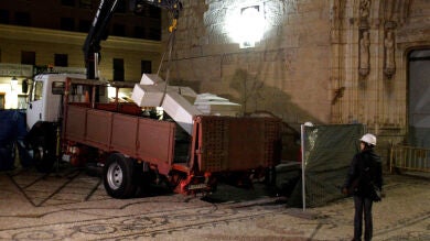 Sobre las 4 horas han comenzado los trabajos previos del desmontaje por parte de cinco operarios municipales y a las 6.15 se ha conseguido quitar la cruz del pedestal y subirla a un camión grúa. Tras la retirada de la cruz han comenzado los trabajos para desmontar el pedestal, que es de mármol blanco, igual que la cruz. En el momento en el que la cruz de los caídos se ha separado de la base, se han producido insultos entre una decena de vecinos favorables a la retirada, con gritos que incluían lemas a favor de la República, y otra decena de personas que querían la permanencia del monumento.
