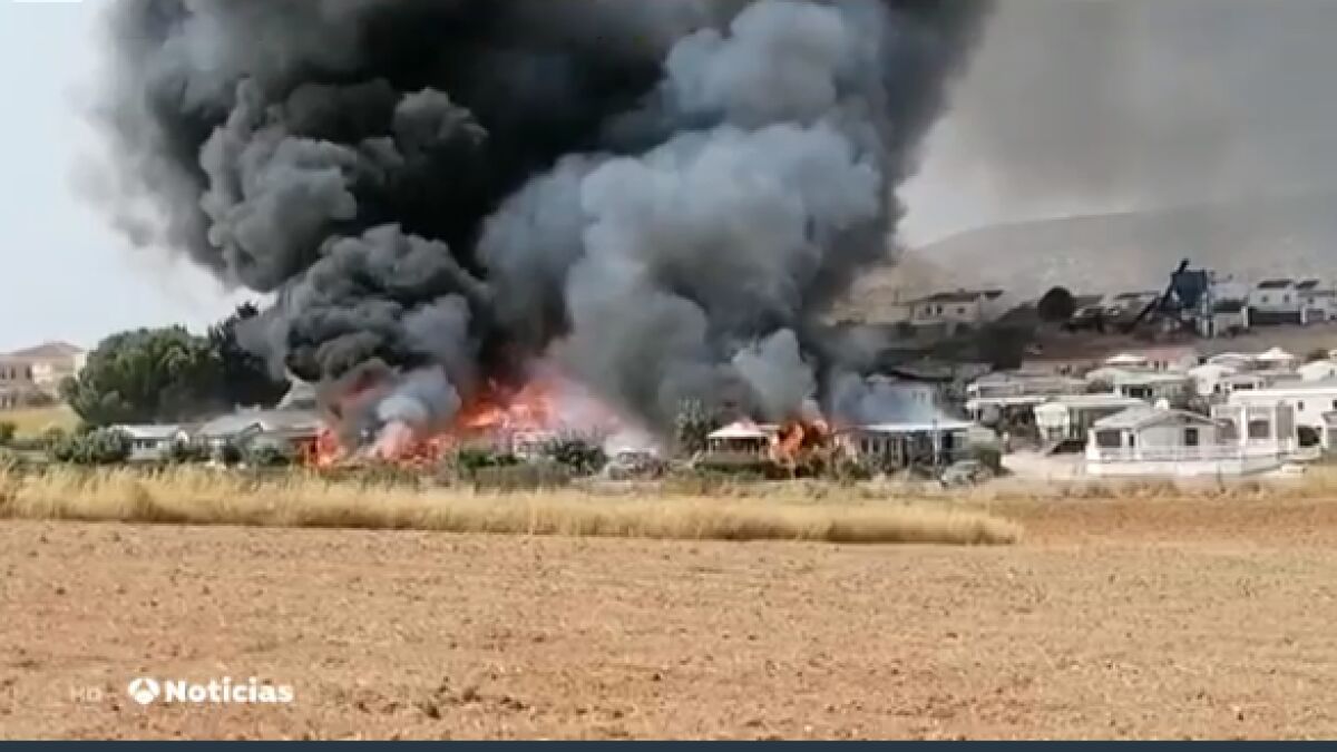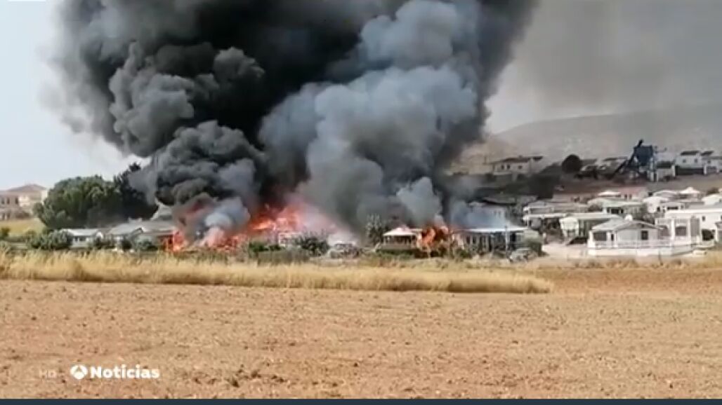 Un incendio arrasa el camping de Mollina, en Málaga. Las llamas han acabado con buen parte de las casa prefabricadas de las instalaciones y 90 personas han tenido que ser desalojadas, y algunas han sufrido ataques de ansiedad.