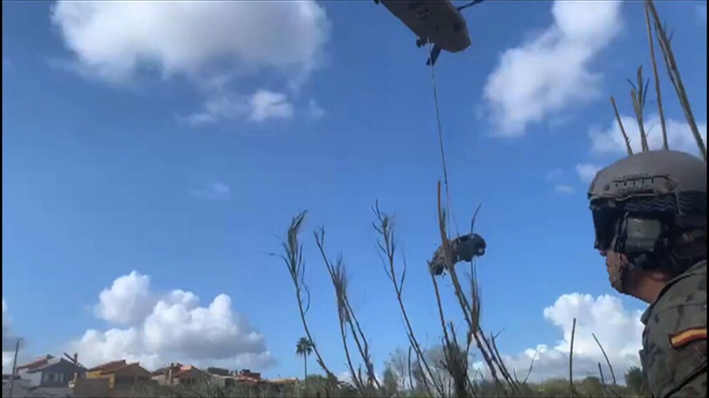 Estos helicópteros se utilizan para acceder a los coches que han quedado atrapados tras la DANA en barrancos y en zonas de difícil acceso. Son capaces de levantar hasta 8.000 kilos de peso. Los militares enganchan con varios cables el helicóptero a los coches, los levantan y en el aire los dejan en zonas donde se pueden recuperar.