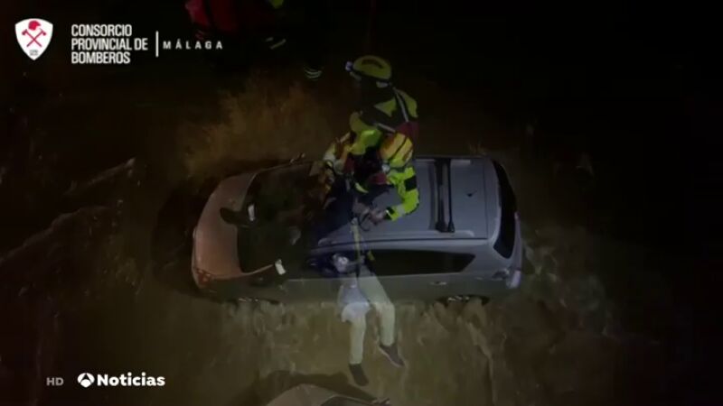 Este es el momento en el que era rescatado un hombre que había quedado atrapado en su coche... ocurrió en Estepona, también en la provincia de Málaga. Fue sorprendido por la crecida del río Guadalmansa y pudo ser rescatado sano y salvo.