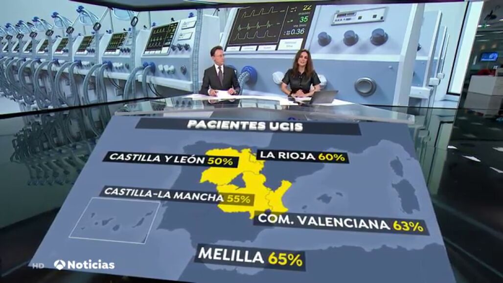España es el país con mayor porcentaje de enfermos en la UCI por habitante. Melilla (65%), la Comunidad Valenciana, (63%) La Rioja (60%) Castilla la Mancha (55%) y Castilla y León (50%) son las comunidades con la UCI con mayor saturación de pacientes covid.
