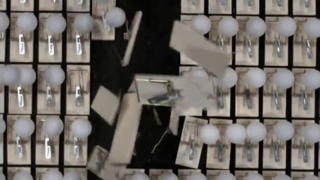 En las imágenes se ve como lanzan una pelota a una mesa llena de trampas para animales. Cuando las trampas están juntas, todas salen volando por los aires. Sin embargo, cuando hay una distancia entre unas y otras todo no sucede nada.