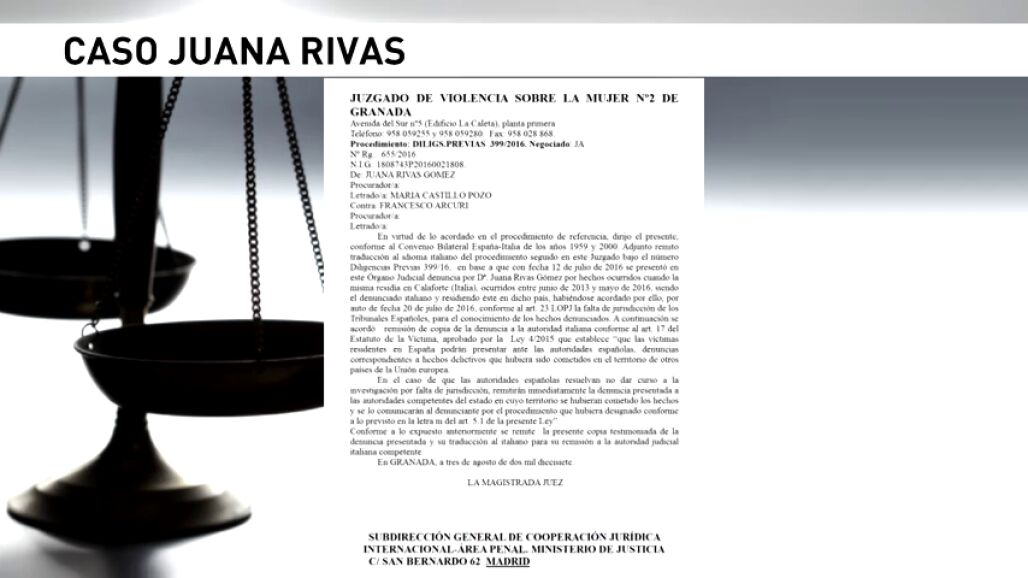 Mayo de 2016. Juana Rivas viaja a España con sus dos hijos, con la excusa de pasar las vacaciones en su pueblo, Maracena. Nunca vuelve a Italia. Y en julio de ese año interpone una denuncia por malos tratos ante el juzgado de violencia sobre la mujer de Granada. Éste juzgado la rechaza alegando que no tiene jurisdicción.