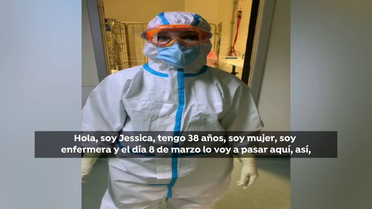 Jessica es enfermera, tiene 38 años y asegura que este "día 8 de marzo lo voy a pasar aquí, así vestida de EPI. No hace falta ir a ninguna manifestación para sentirme mejor mujer".