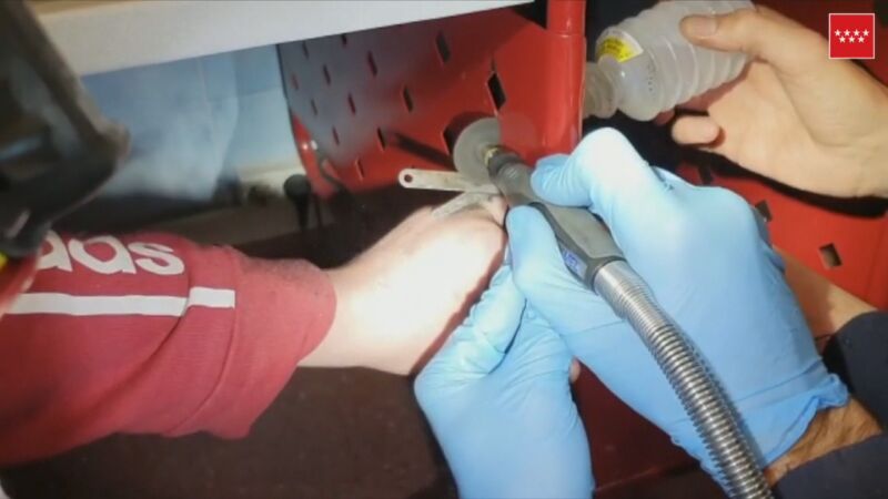 El momento en el que los bomberos liberan el dedo de un niño de 14 años en un instituto de San Fernando de Henares, Madrid