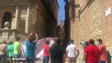 Una veintena de trabajadores del mundo taurino protesta ante la ministra de Trabajo y Economía Social, Yolanda Díaz. La ministra acudía a un acto celebrado en Toledo. Los trabajadores la recibieron al grito de "ministra dimisión".