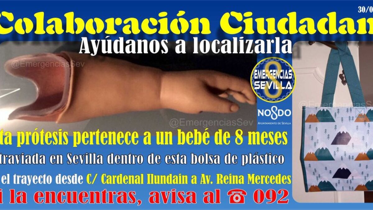 Hola, necesito ayuda. He perdido la prótesis de brazo de mi hijo en Sevilla, entre el Hospital Virgen del Rocío y la facultad de Biología (camino hecho en moto por Cardenal Illundain). Por favor difundid, es muy importante.