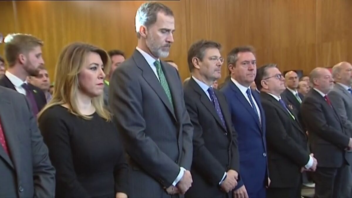 Acompañado de la presidenta de la Junta de Andalucía, Susana Díaz, junto a los alcaldes de Sevilla, Juan Espadas, y de Málaga, Francisco de la Torre, y de varios consejeros de la Junta y otras autoridades, el Rey ha guardado un minuto de silencio convocado mientras se celebraba la conferencia de Isidro Laso Ballesteros, director del sector de Startups en Europa de la Comisión Europea.